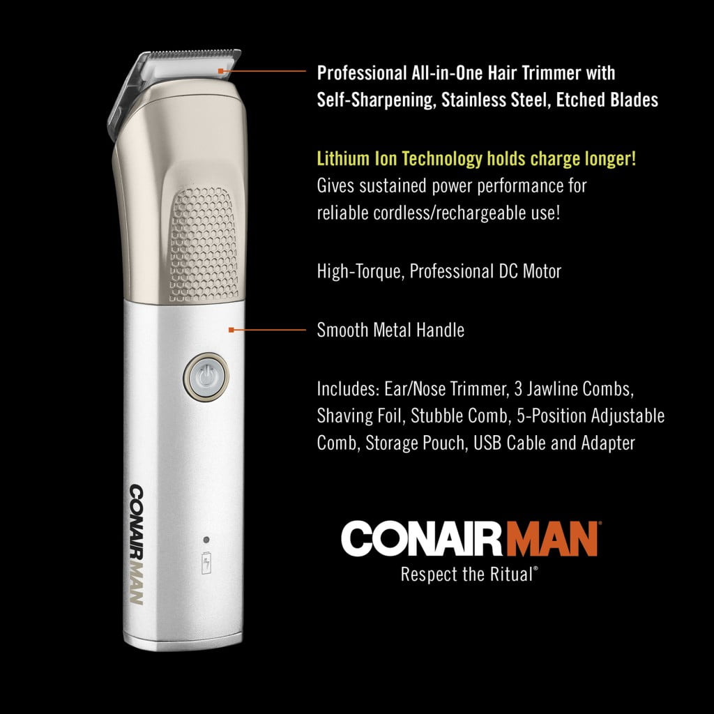 Free anti-chafe stick with 30 personal care purchase. The ConairMAN CordCordless Rechargeable 20 piece Haircut Kit with Lithium Ion Technology provides over 1 hour sustained power performance for. The ConairMan 20-Piece Lithium Ion CordCordless Haircut Kit by Conair is powered by Lithium Ion technology for powerful performance lasting over an hour on a charge for reliable cord-free.