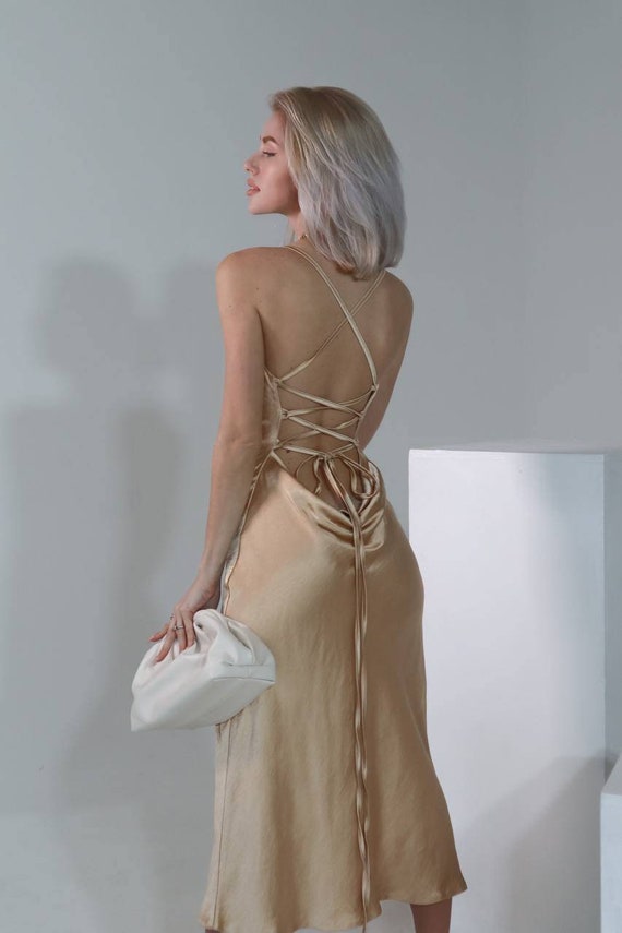 Gold Seide Slip Open Back Midi Kleid Fur Frauen Sexy Flowy Etsy Osterreich